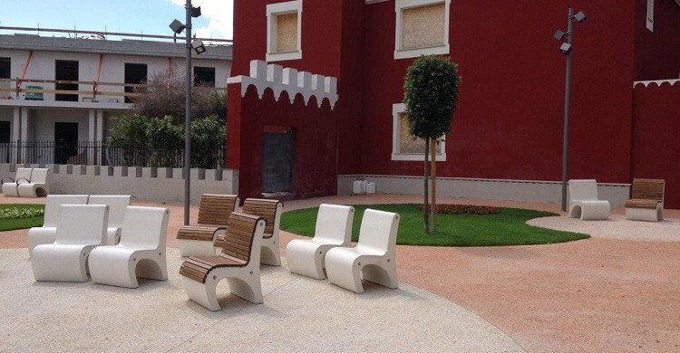 Chair made of reconstituted natural marble or white granite conglomerate. Sandblasted finish. Pine slat seat. Anti-decay coating. Optional anti-graffiti coating. Optional Okume or hardwood seat.